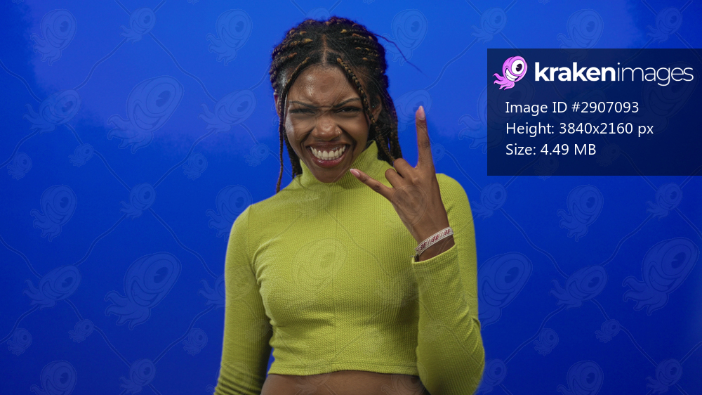 Woman showing rock horns with both hands in studio with blue backdrop, wearing green crop top and braided hair; joy celebration.