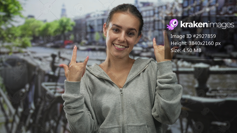 Woman showing rock horns hand gesture with bare hands on a street in amsterdam by a canal, smiling in a gray hoodie; playful.
