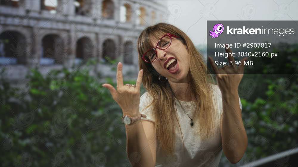 Woman showing rock horns with hands at coliseum building, wearing red glasses and white tshirt; playful travel adventure.