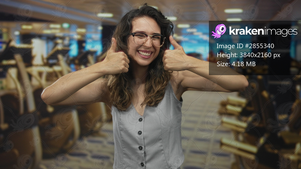 Woman showing smiling face and thumbs up gesture beside treadmill in a well lit building; confidence.