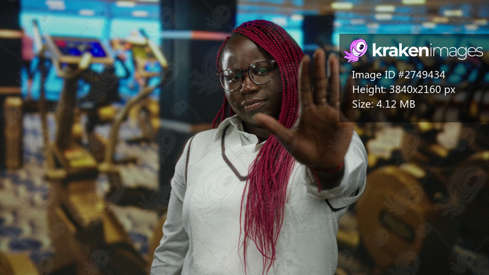 Woman showing stop gesture in an indoor gym environment surrounded by fitness equipment, conveying a sense of determination and focus with pink braids and eyeglasses. - Kraken Images