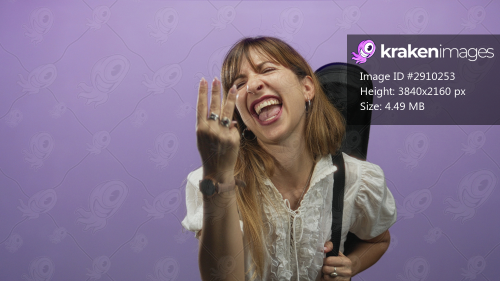 Woman showing three fingers and a wristwatch against purple studio wall while holding a backpack strap; playful confidence.