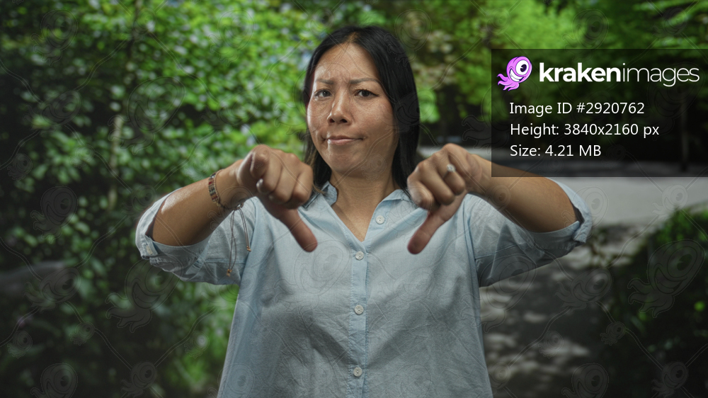 Woman showing thumbs down gesture with bare hands in park among green trees and a paved path; disapproval criticism.
