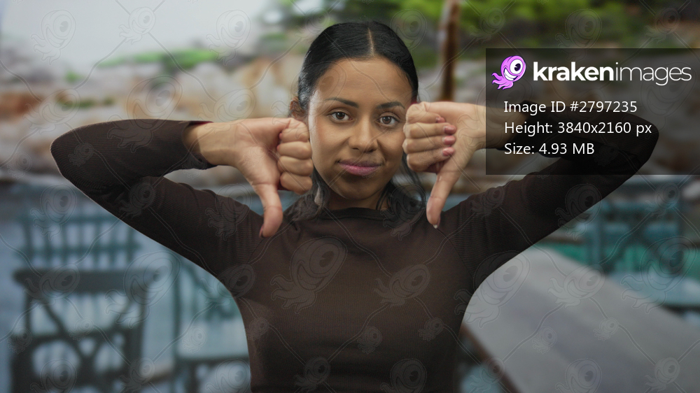 Woman showing thumbs down gesture on outdoor restaurant terrace expressing disapproval with outdoor seating and blurred street in background under daytime lighting conditions. - Kraken Images