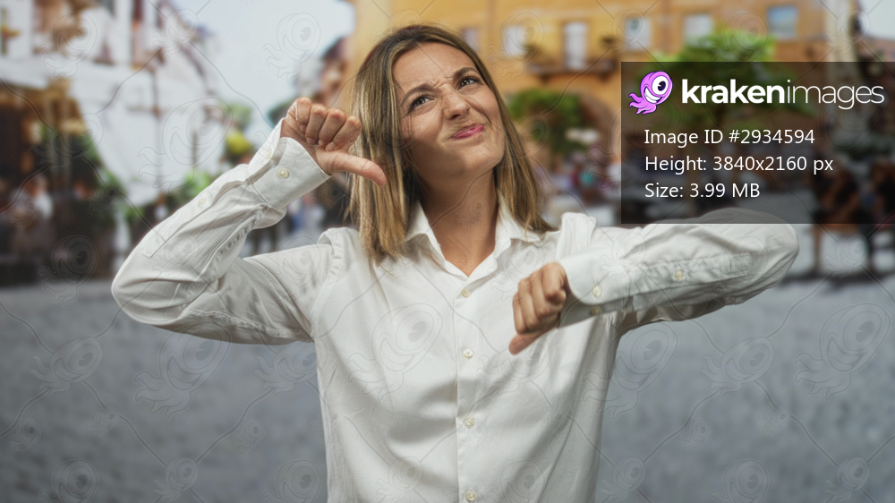 Woman showing thumbs down with hands and a shrugged face on a street with buildings; disapproval critique.