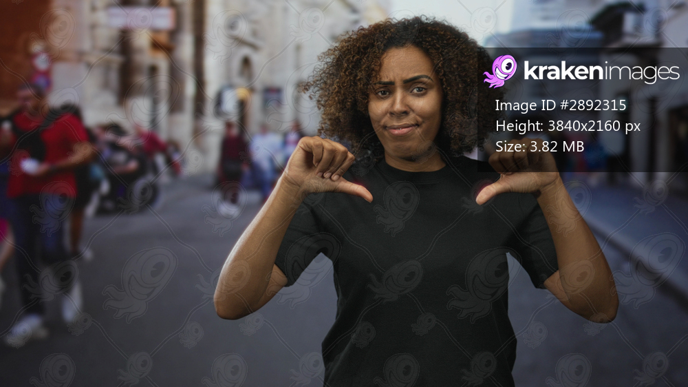 Woman showing thumbs down with hands visible on a crowded city street while smirking slightly; disapproval dissent.