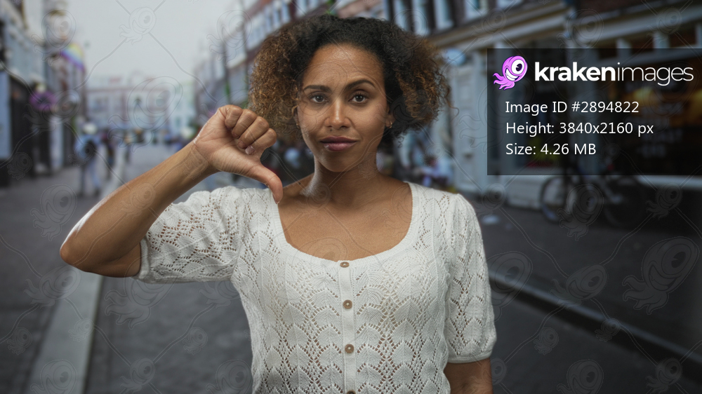Woman showing thumbs down with visible thumb and closed eyes on a city street with storefront and bicycle; urban disapproval.
