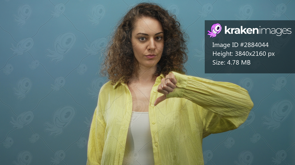 Woman showing thumbs down with visible thumb and hand in blue studio wearing yellow shirt; disapproval.