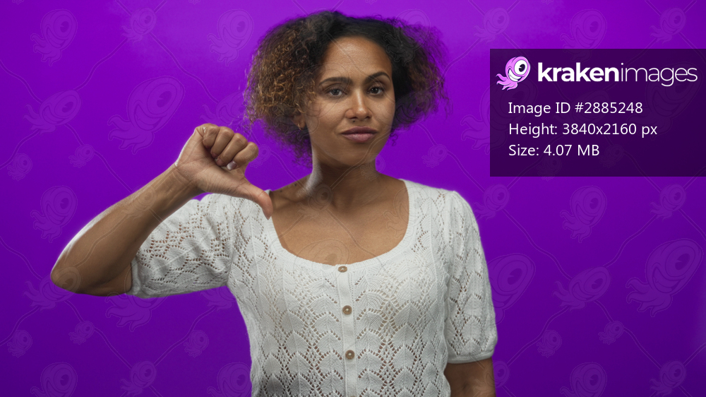 Woman showing thumbs down with visible thumb and hand in purple studio; disapproval rejection criticism negativity.