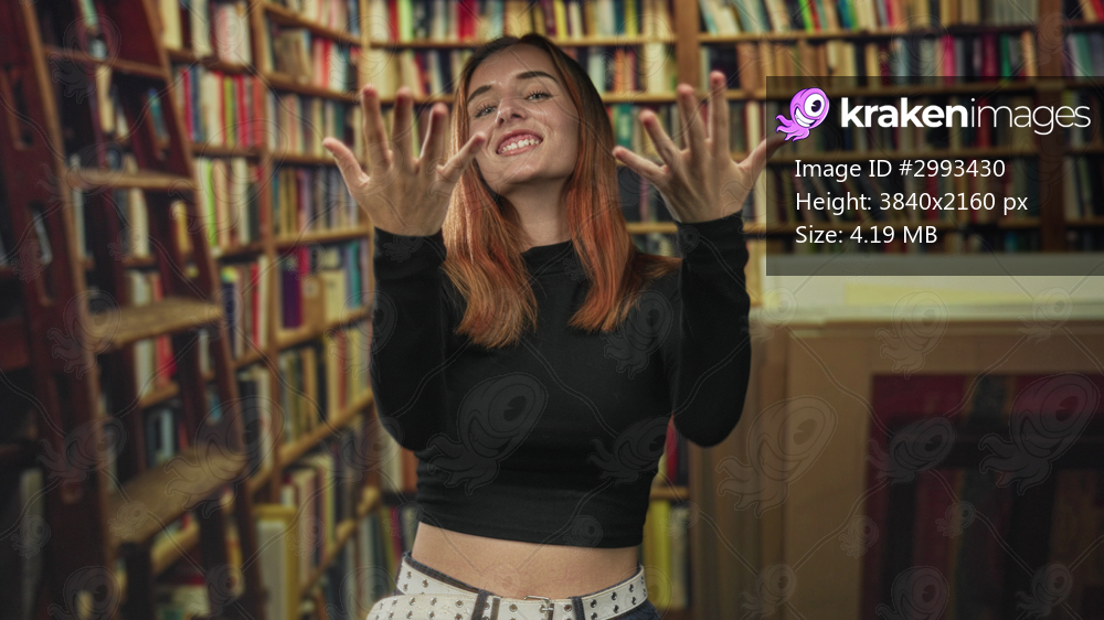 Woman showing thumbs to chest and open palms pointing toward camera among bookshelves in a building; playful confidence.