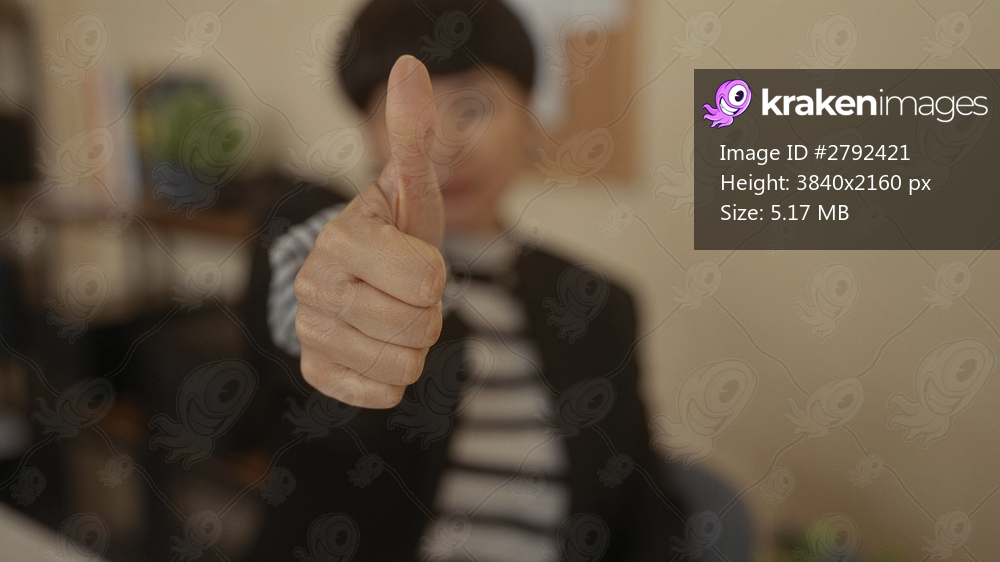 Woman showing thumbs up and down gestures in an office, wearing a striped shirt, conveys positivity and negativity in a professional indoor setting.