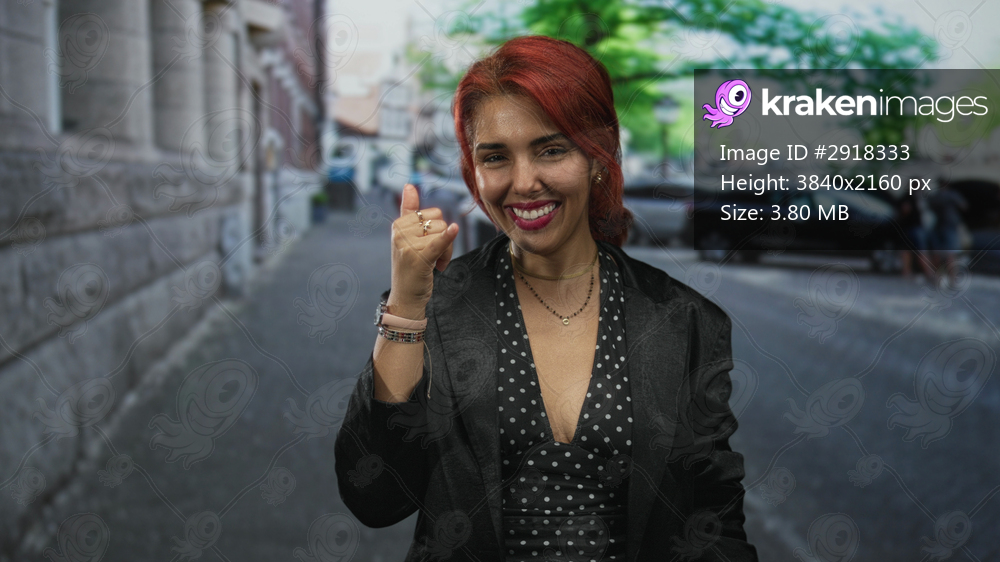 Woman showing thumbs up with exposed hand and smiling on a cobblestone street with parked cars and trees; urban confidence.