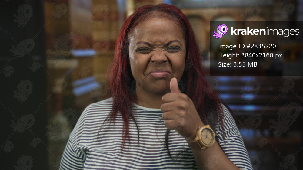 Woman showing thumbs up in a historic church interior with wooden pews stained glass windows and brick columns; approval.