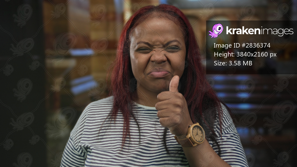 Woman showing thumbs up in a historic church interior with wooden pews stained glass windows and brick columns; approval.