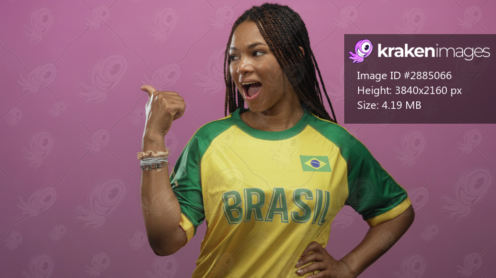 Woman showing thumbs up with left hand wearing yellow and green brasil jersey with visible brazil flag patch in studio pink backdrop; team pride.