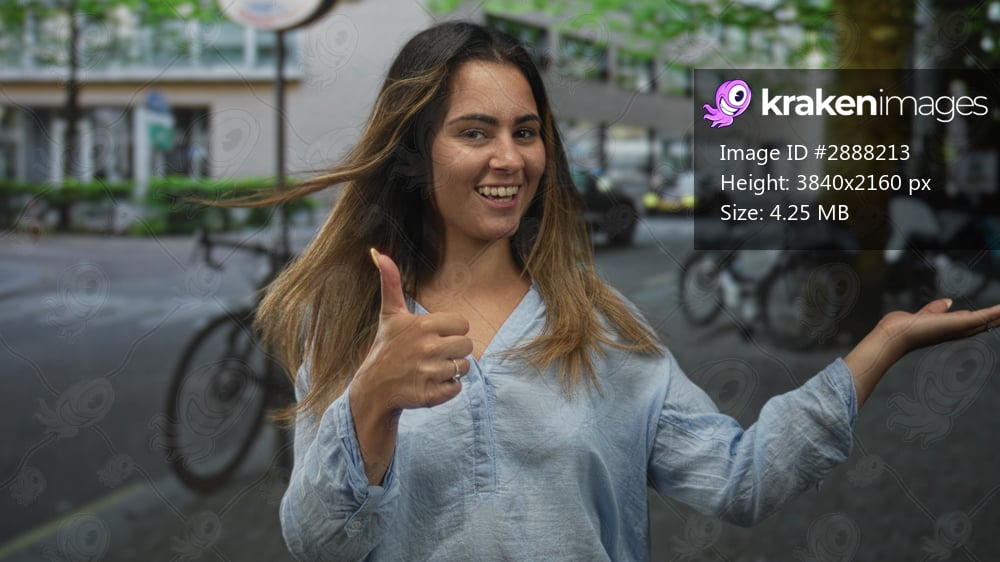 Woman showing thumbs up and open palm on a city street with parked bicycles and cars, smiling with closed eyes; joy confidence.
