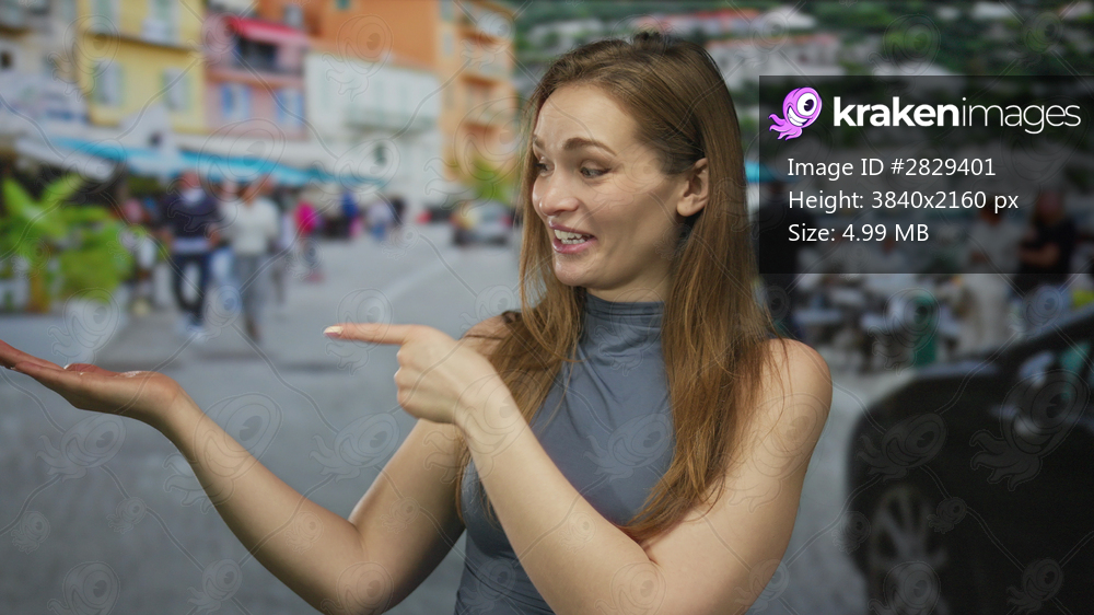 Woman showing thumbs up and pointing finger with open palm display in busy street amid blurred pedestrians; approval.