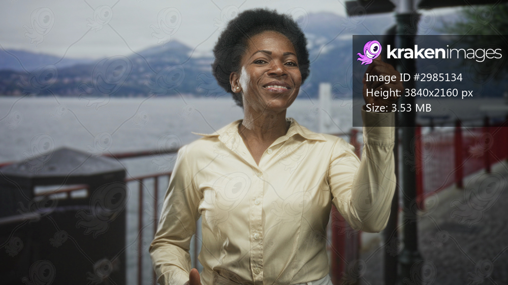 Woman showing thumbs up with raised fist and smile beside a railing by a lake on a street promenade; confidence celebration.
