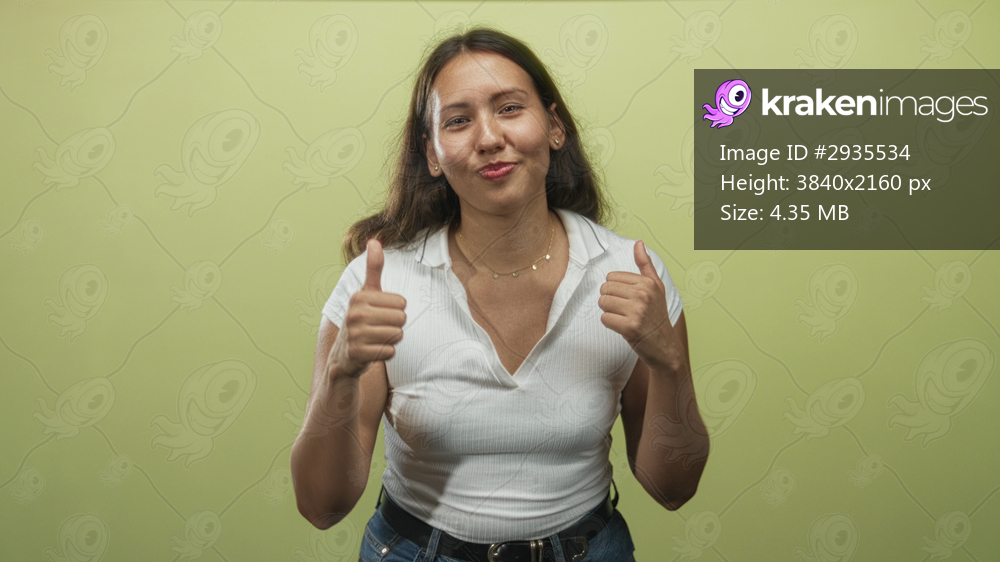 Woman showing thumbs up and smiling in green studio wearing a white top and jeans, visible hands and necklace; friendly optimism.