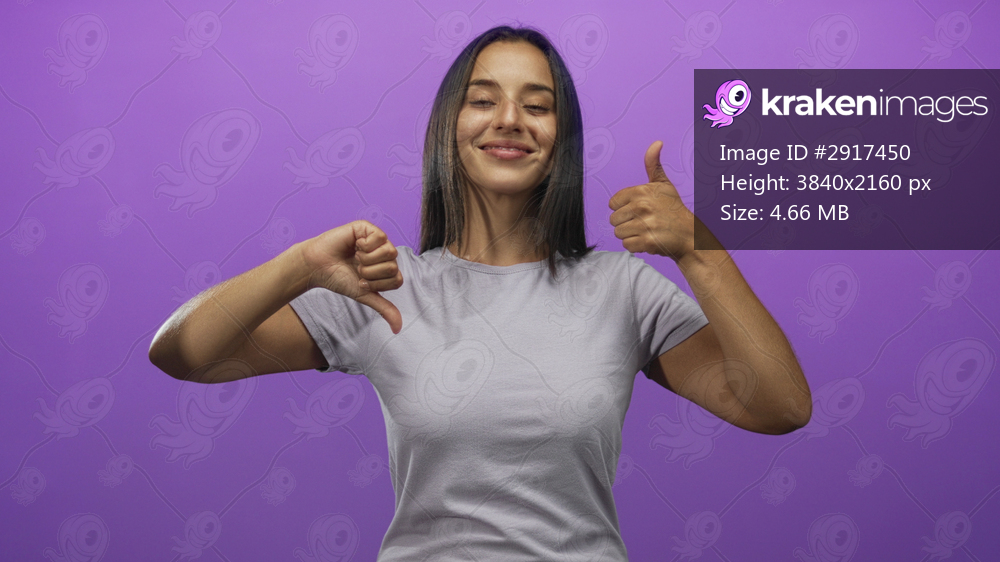 Woman showing thumbs up and thumbs down with both hands in a purple studio, frontal pose with visible hands and neutral expression; ambivalence.