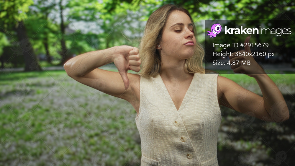 Woman showing thumbs up and thumbs down in park among green trees and grass wearing sleeveless beige vest and smirk expression; indecision choice conflict. - Kraken Images