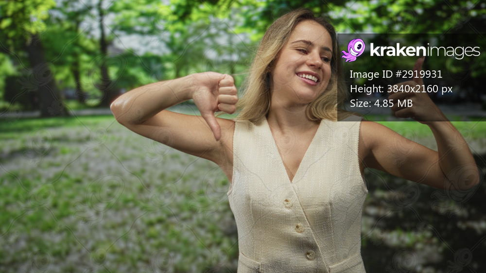 Woman showing thumbs up and thumbs down in park among green trees and grass wearing sleeveless beige vest and smirk expression; indecision choice conflict. - Kraken Images