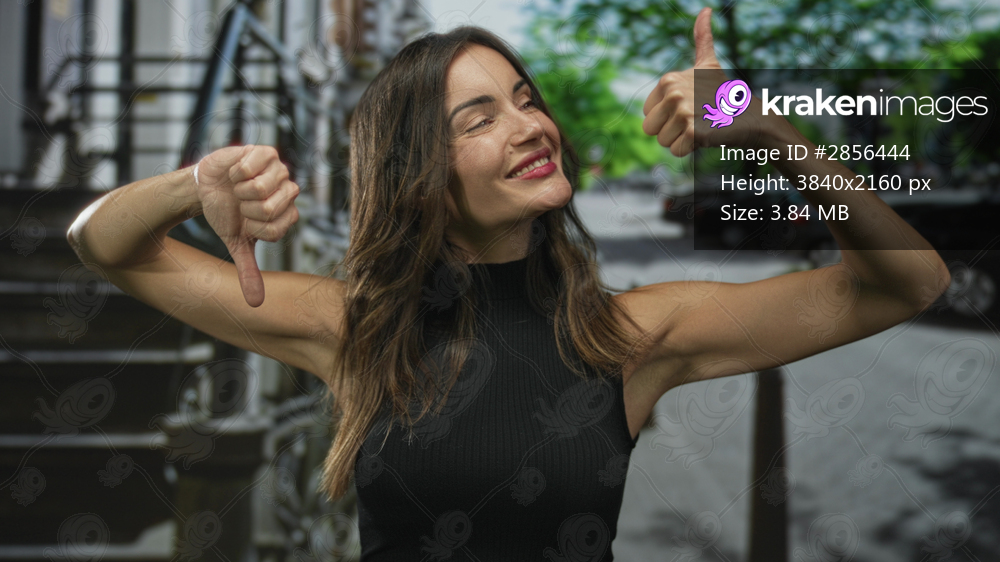 Woman showing thumbs up and thumbs down with outstretched arms on sunny city street in summer; indecision.
