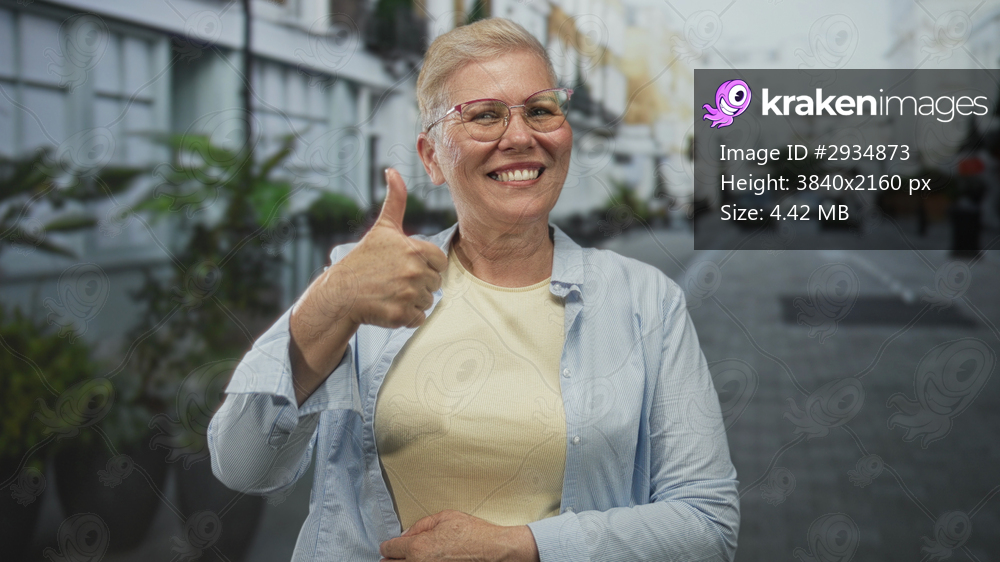 Woman showing thumbs up with visible hand and big smile on city street wearing glasses and casual shirt; friendly optimism.