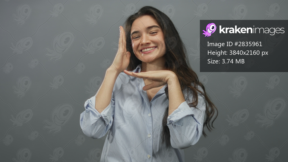 Woman showing time out gesture with hands in grey studio setting, smiling broadly and wearing a striped shirt; playfulness.