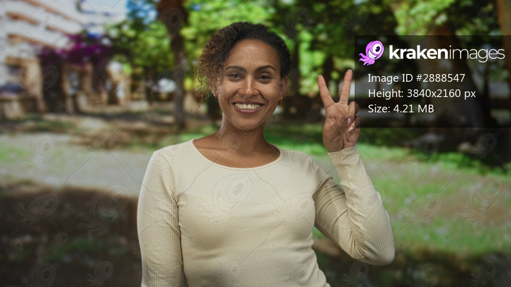 Woman showing two finger peace sign with right hand in forest setting, smiling and standing among trees near a park walkway; joy peace.