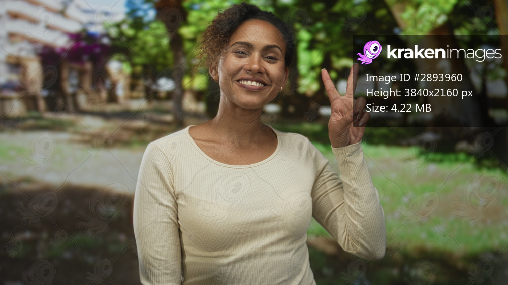 Woman showing two finger peace sign with right hand in forest setting, smiling and standing among trees near a park walkway; joy peace.