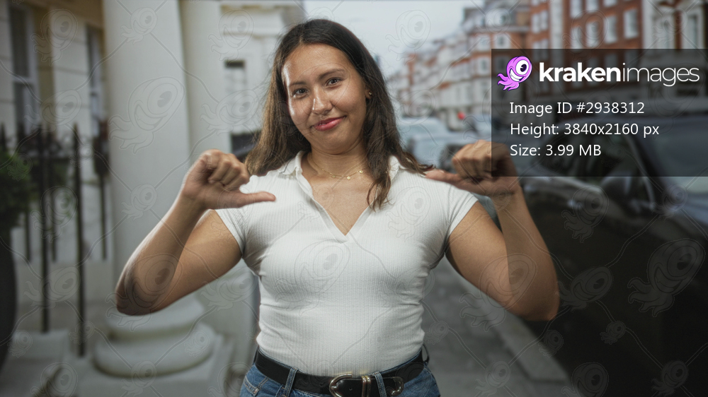 Woman showing two thumbs down with both hands on a city street in front of parked cars and buildings; disapproval.