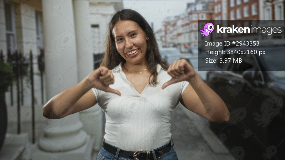 Woman showing two thumbs down with both hands on a city street in front of parked cars and buildings; disapproval.