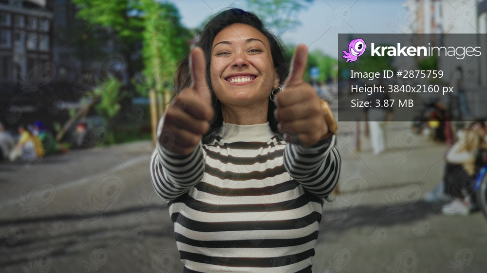Woman showing two thumbs up on a busy city street wearing a striped sweater and smiling broadly; encouragement joy.