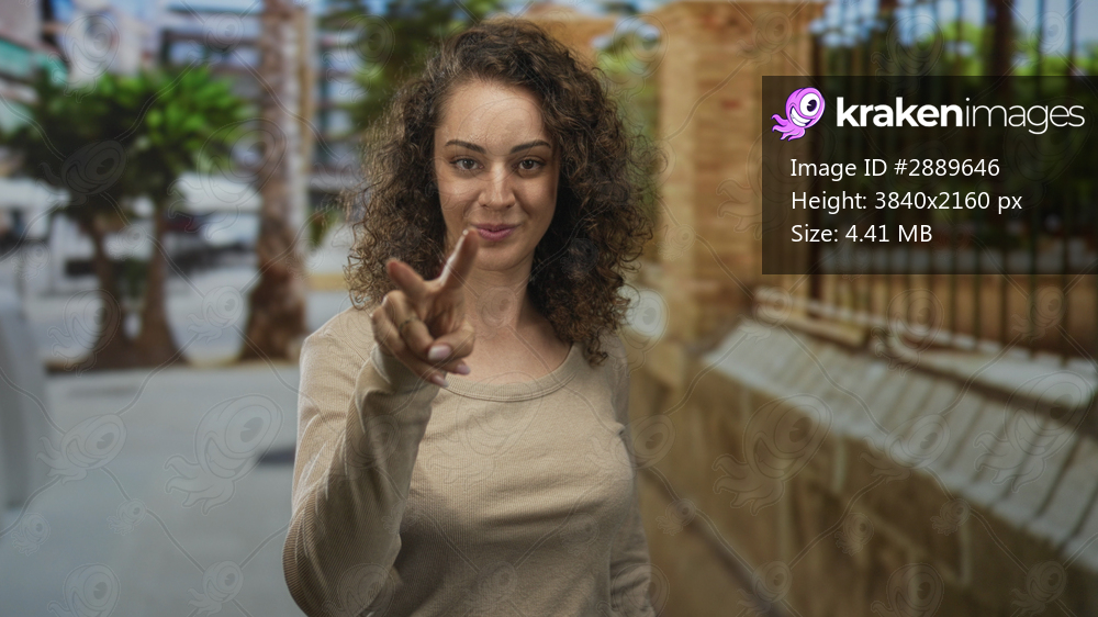Woman showing v sign with fingers near face on sunlit city street beside stone building wearing beige top and curly hair; playful mischief.