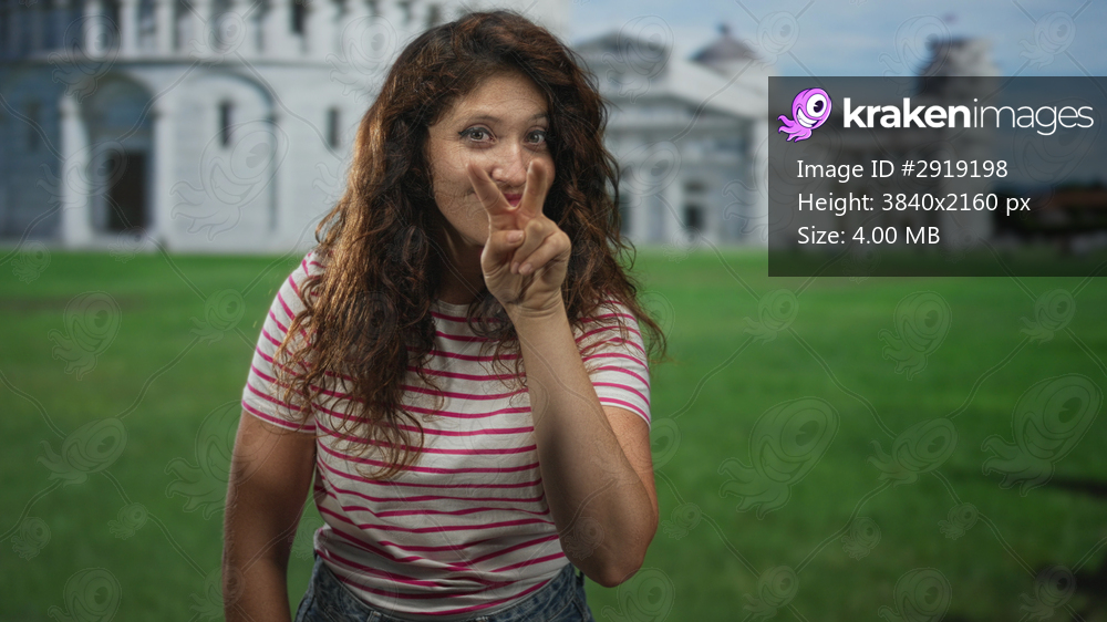 Woman showing v sign with fingers and smiling in striped shirt on green lawn in front of building at pisa tower; playful.
