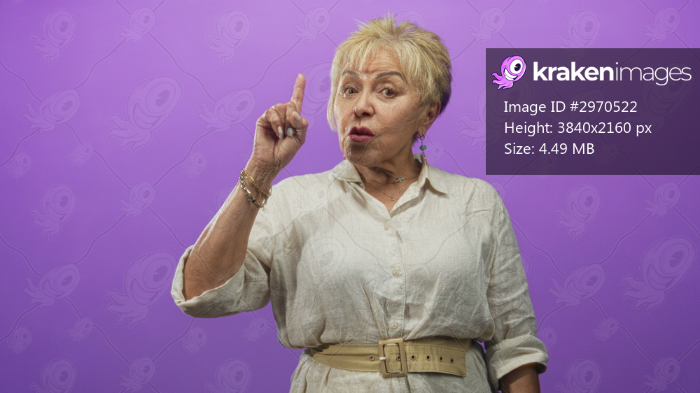 Woman showing victory sign with raised fingers, wearing linen shirt and beige belt, visible earrings and bracelets against purple studio backdrop; confidence peace.