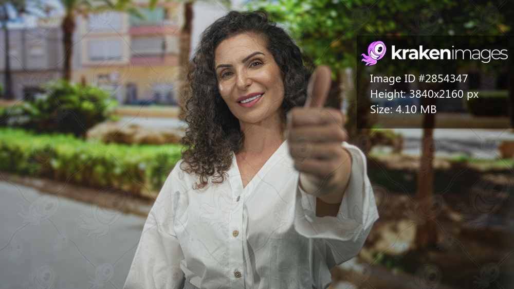 Woman shows bare thumb in a thumbs up gesture at green park path under bright sunlight; positivity.