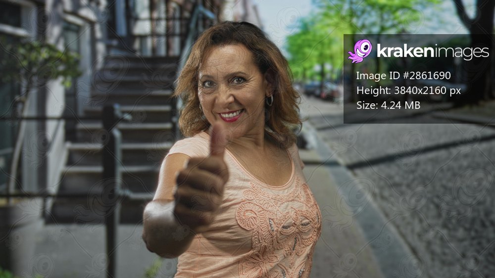 Woman shows both thumbs up gesture under early morning sunlight on urban street; approval and confidence.