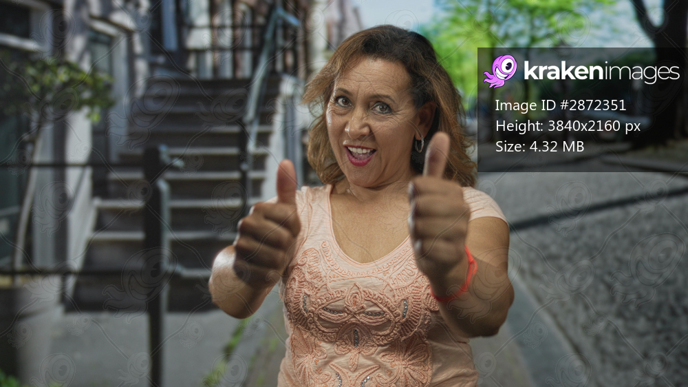 Woman shows both thumbs up gesture under early morning sunlight on urban street; approval and confidence.