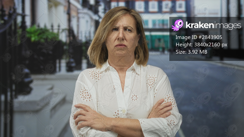 Woman shows crossed arms and scowls with furrowed brow on street under daylight in urban neighborhood; annoyance.