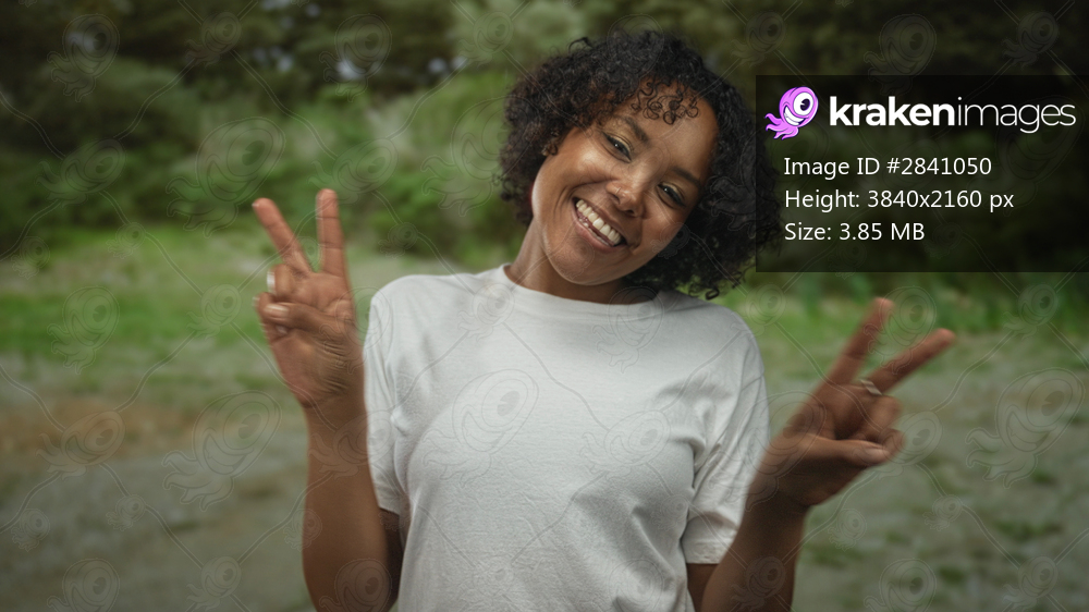 Woman shows double peace sign with both hands in forest clearing, smiling brightly; peace harmony optimism contentment.