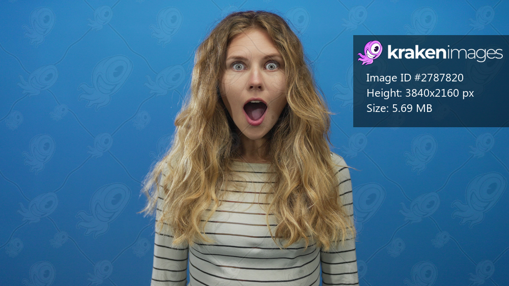Woman shows face filled with surprise in a studio as her blonde young hair frames her hands against a blue background.