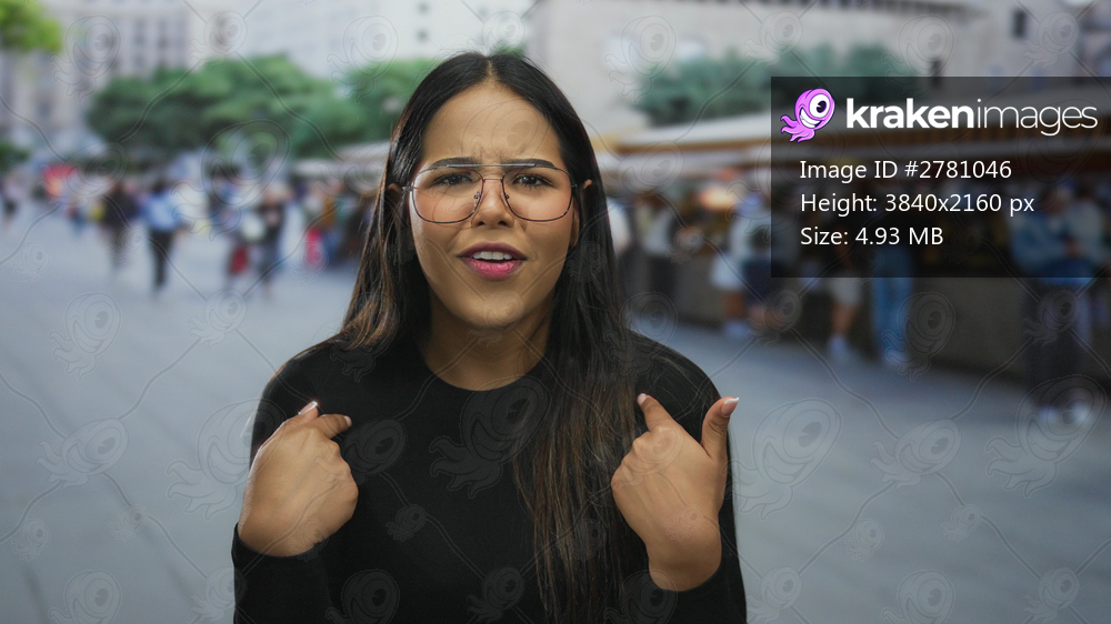 Woman shows finger gesture on street in a young latin hispanic outdoor market city.