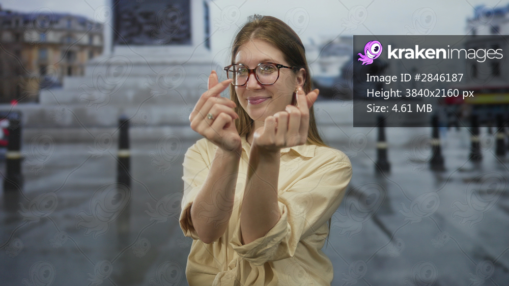 Woman shows finger heart gesture on rainy street by stone monument with bollards and city buildings; love.