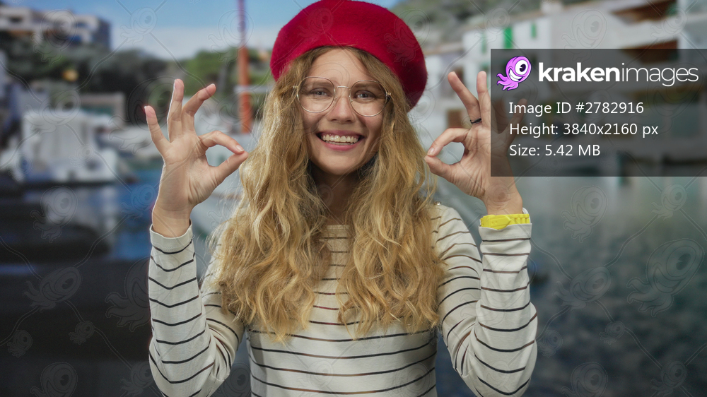 Woman shows her hands gesturing at boats in a harbor, a blonde young traveler wearing a red beret and glasses smiling in a striped shirt.