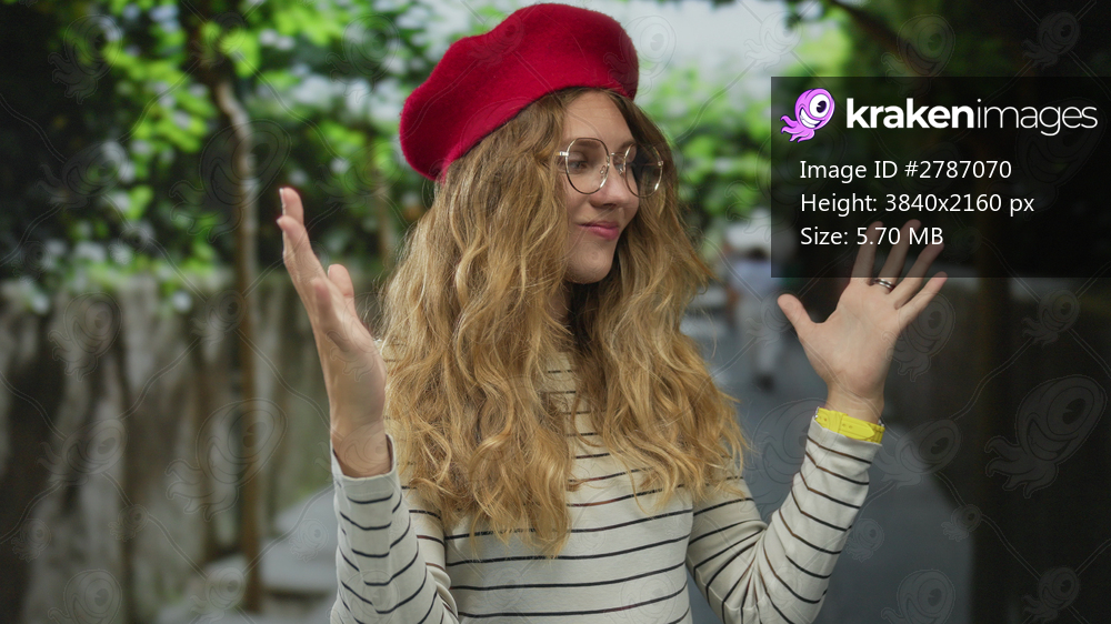 Woman shows her hands shrugging on a street while sporting a blonde young appearance with glasses and a beret in an outdoor setting, smiling softly.