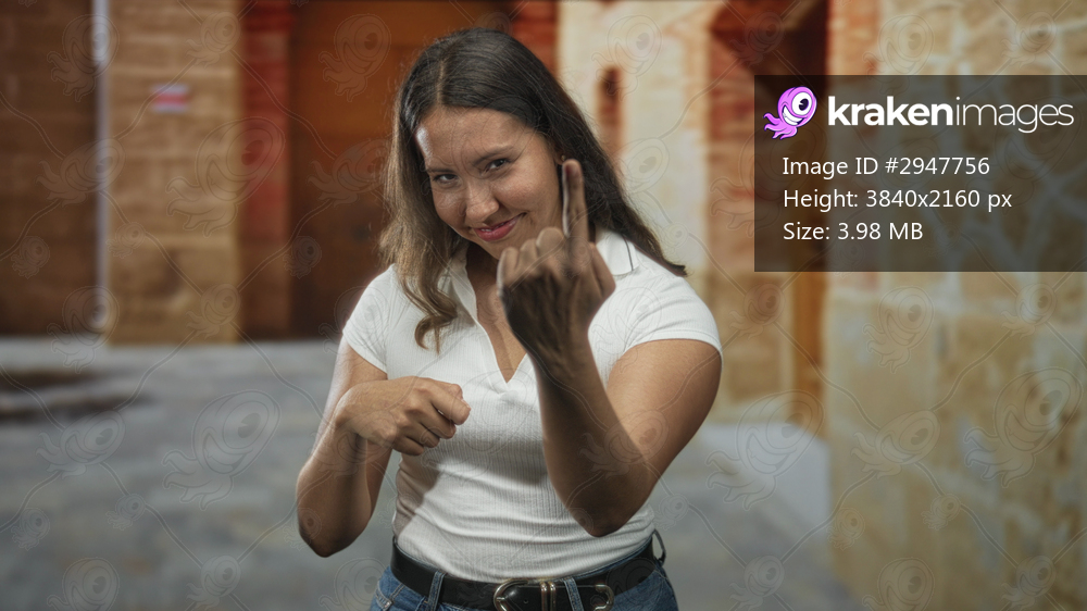 Woman shows middle finger and clenched fist while smiling on an old town cobblestone street by a stone building archway; defiance protest.