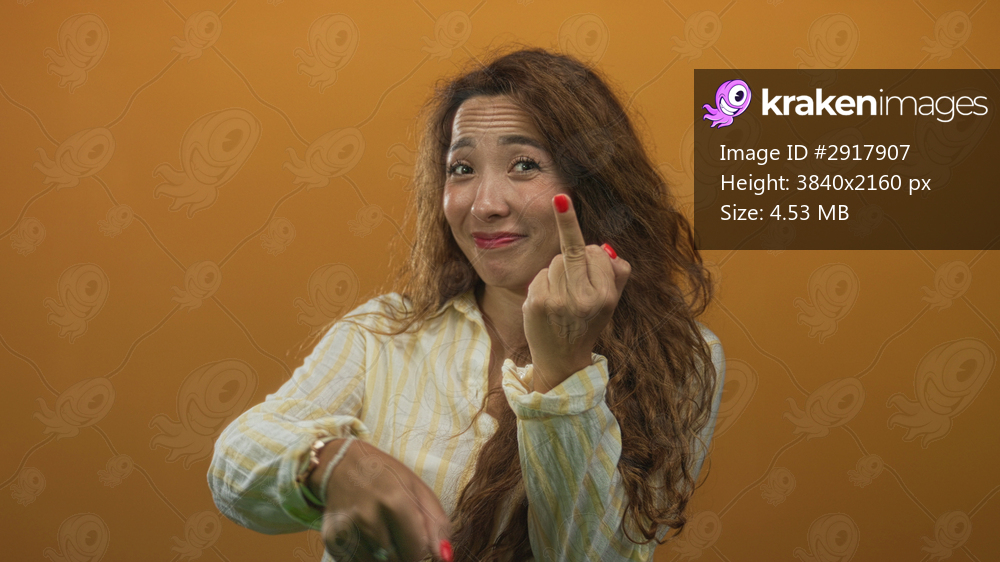 Woman shows middle finger and gestures with the other hand in studio with orange wall wearing striped shirt; defiance.