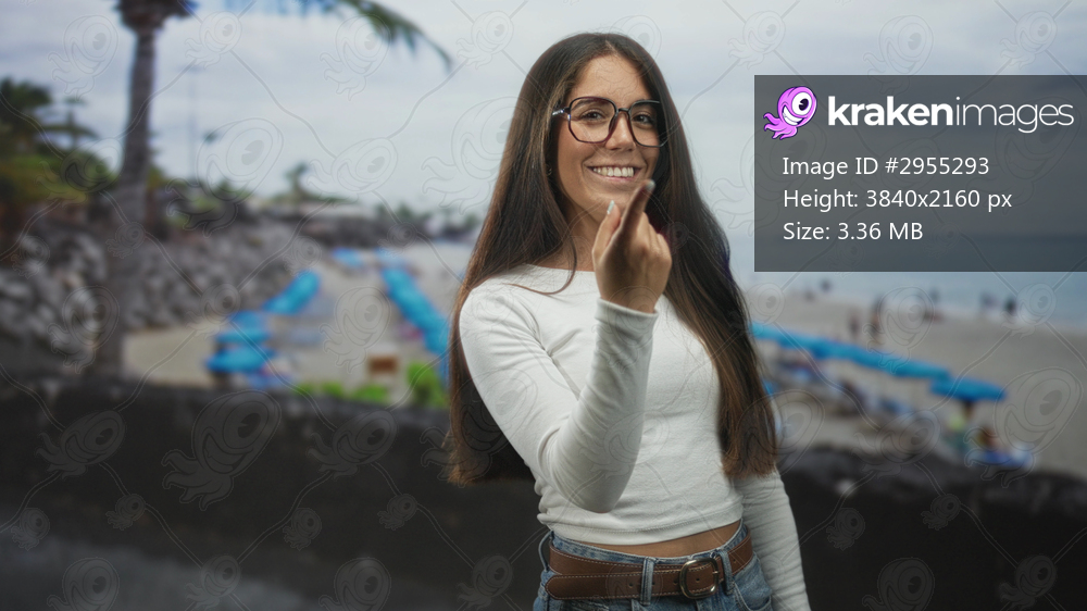 Woman shows middle finger to camera on a crowded tropical beach, smiling and wearing large eyeglasses, a white top and jeans; playful defiance.